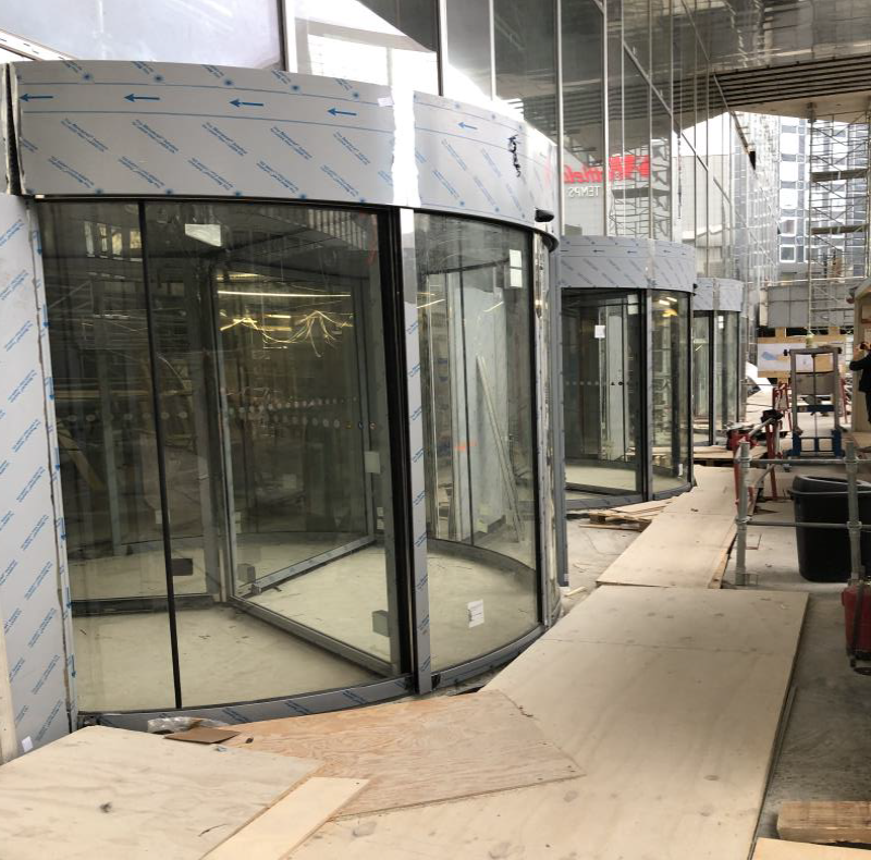 Installation de portes automatiques et tourniquets pour centre commercial. Solution complète pour gestion d'accès client et zone réservée.